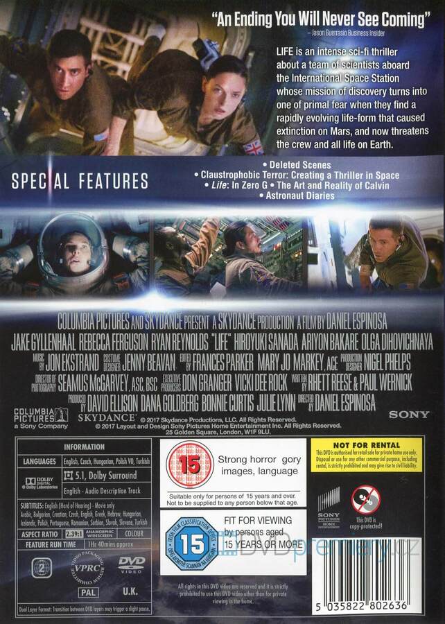 DVD film Život [2017]. Český dabing. České titulky. Dolby Digital. Dovoz. Napínavý sci-fi thriller o týmu vědců na palubě Mezinárodní vesmírné stanice, jehož vědecké poslání se změní v holý boj o přežití.