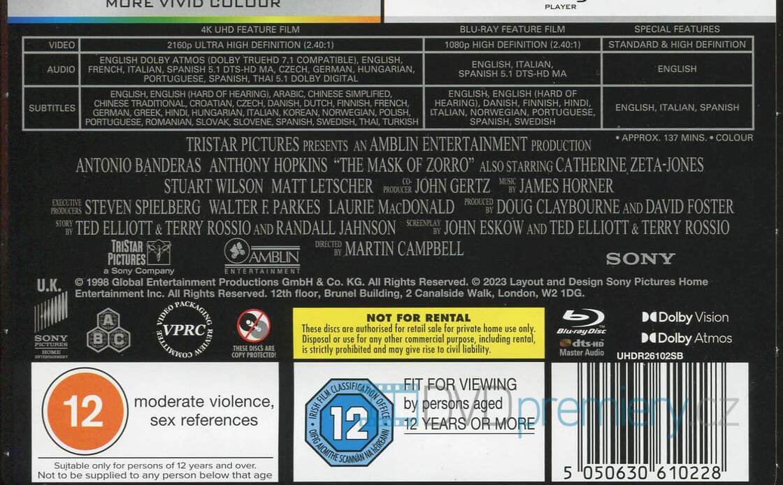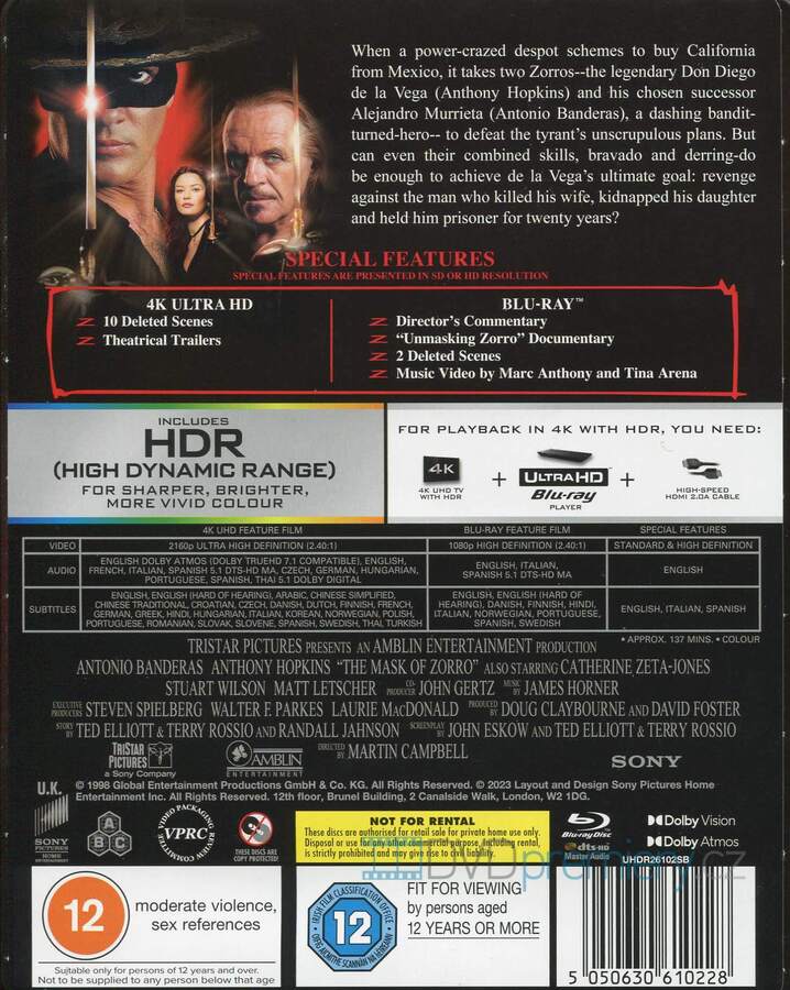 4K Blu-ray film Zorro: Tajemná tvář HD [1998]. Český dabing. České titulky. HDR. Dolby Digital. Dolby Atmos. Dovoz. Steelbook sběratelské balení. Starý hrdina, nový nástupce. Společně zastaví despotu a vyrovnají účty s minulostí.