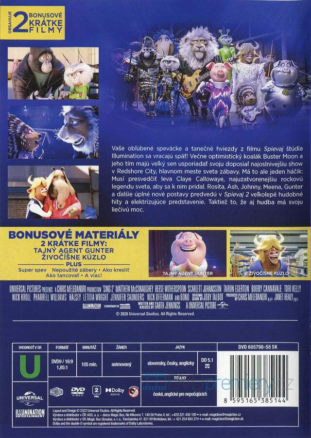 DVD film Zpívej 2 [2021]. Český dabing. České titulky. Dolby Digital. Dovoz SK. I animák Zpívej 2 je plný těch největších hudebních pecek současnosti, ale i lety prověřených písniček.